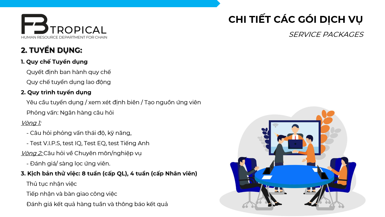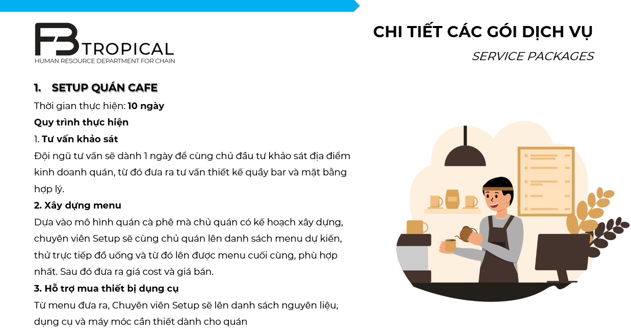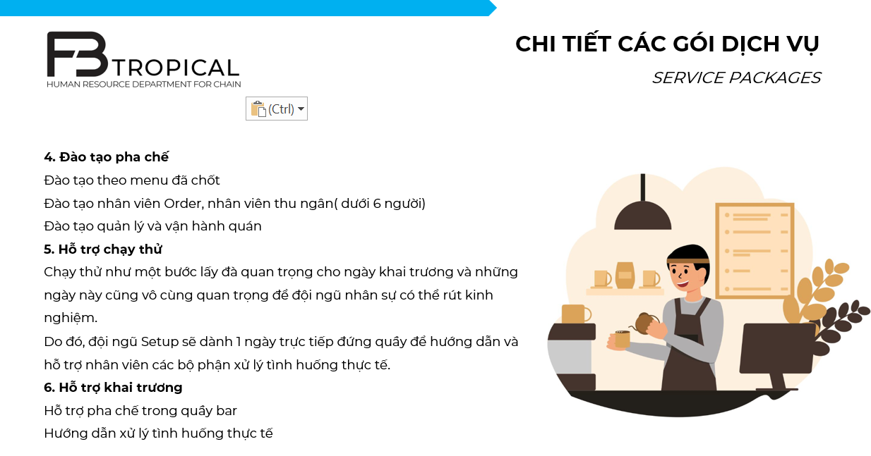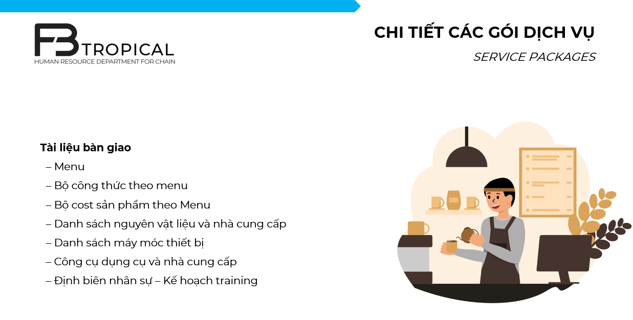 Tùy theo như cầu và quy mô của từng doanh nghiệp, từng chủ đầu tư quán, F&B Tropical sẽ cùng Anh/Chị thiết kế nên một tiêu chuẩn Hành chính Nhân sự, từ đó sẽ ra từng gói dịch vụ và chi phí hợp lý, phù hợp với Doanh nghiệp Anh/Chị.
